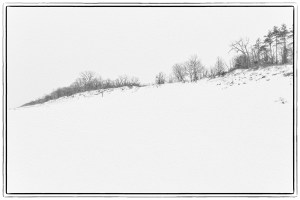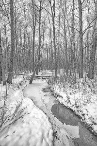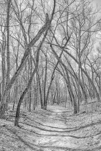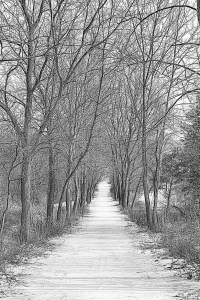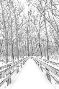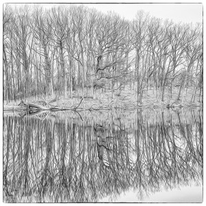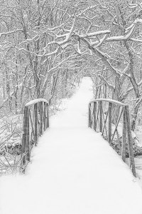 I tend to agree with the narrator in Seek My Face, a John Updike novel about the art world, who comments at one point that “the whole world comes to us, as we experience it, through the mystical realm of color. Our entire being is nourished by it.” Nevertheless, some settings, especially in winter, seem more conducive to depiction in black and white, which lends a sense of abstract atmosphere, perhaps due to the stark juxtaposition of darkness and light. Indeed, Henri Cartier-Bresson, known for mastery of monochromatic photography, wrote in The Decisive Moment, his iconic book: “Black-and-white photography is a deformation, that is to say, an abstraction.”